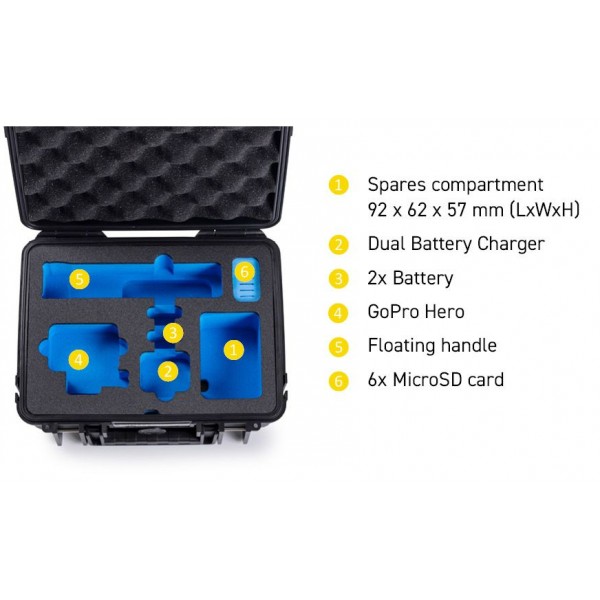 Grâce à son insert en mousse personnalisée, il offre suffisamment d'espace pour la GoPro 9, 10, 11, 12, 13 et les accessoires : le double chargeur de batterie, jusqu'à 3 batteries, jusqu'à 7 microSD, des supports de montage et des câbles.