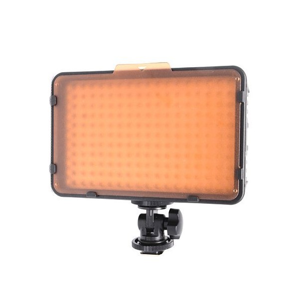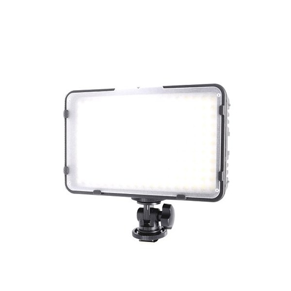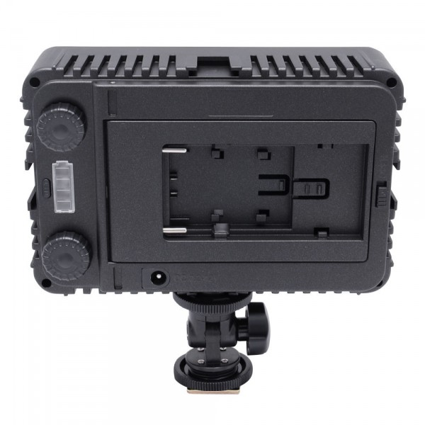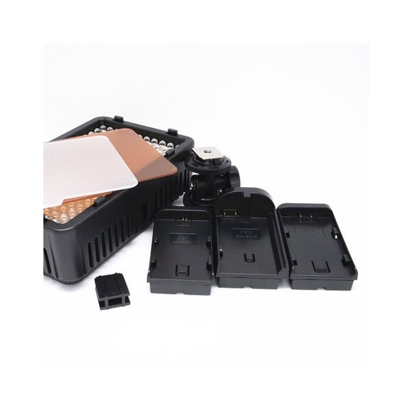 Ce panneau  à LED est compatible avec plusieurs types de batterie : CANON LP-E6, NIKON EN-EL15, PANASONIC D16, SONY NP-F550 / 750/970 et il est possible de le faire fonctionner avec 6 piles AA.