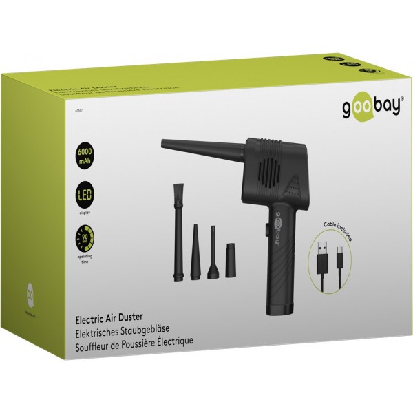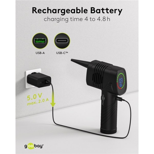 Le souffleur d'air offre une alternative écologique, non toxique et à long terme moins chère aux canettes d'air comprimé. Il est équipé de batteries Li-ion 18650 de haute qualité pour une durée de vie extra longue (câble de charge USB-A vers USB-C™ inclus).