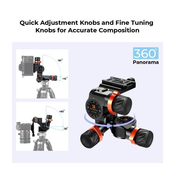 Le fond de la tête du trépied a un trou de vis de 3/8 pouces, il peut être largement appliqué à divers trépieds professionnels; et est également livré avec une plaque de dégagement rapide amovible à vis de 1/4 de pouce, qui convient aux appareils photo SLR, DSLR.